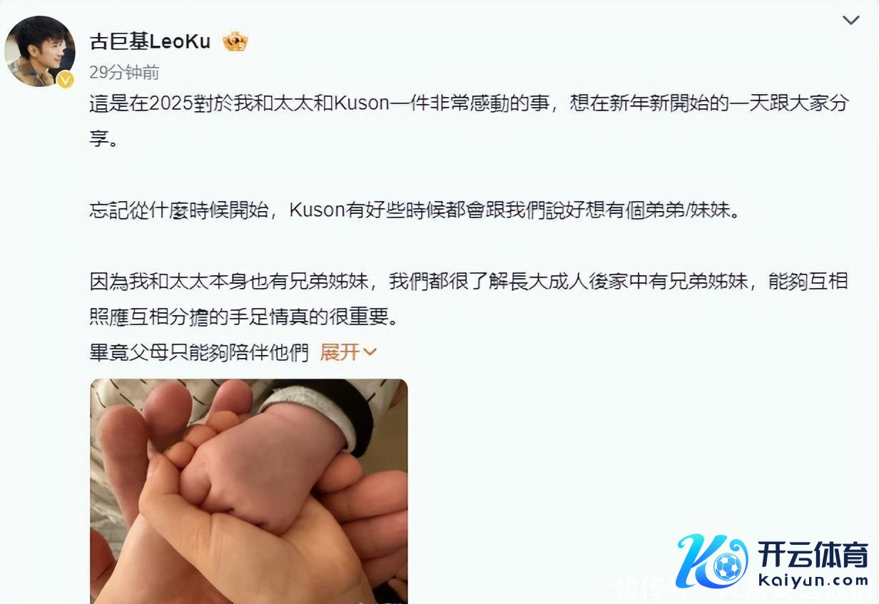 1月1号,古巨基在酬酢网上首肯的文书,两东说念主的二胎犬子仍是降生,并晒出一家四口的叠手照,从曝光的画面中不难揣测,二胎犬子仍是降生有几个月的时刻,因为小手看起来很浩大,也便是说,大犬子与小犬子出入五岁,但那种温馨感却让一众粉丝泪目。