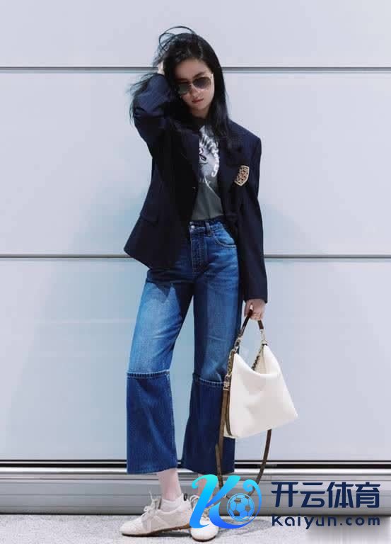 她从机场启航时的造型异常纰漏,经典藏蓝色条纹西装搭配灰色短袖及八分长蓝色牛仔裤,披垂的微卷长发即兴又萧洒,与她的寒冷感黑白分明。