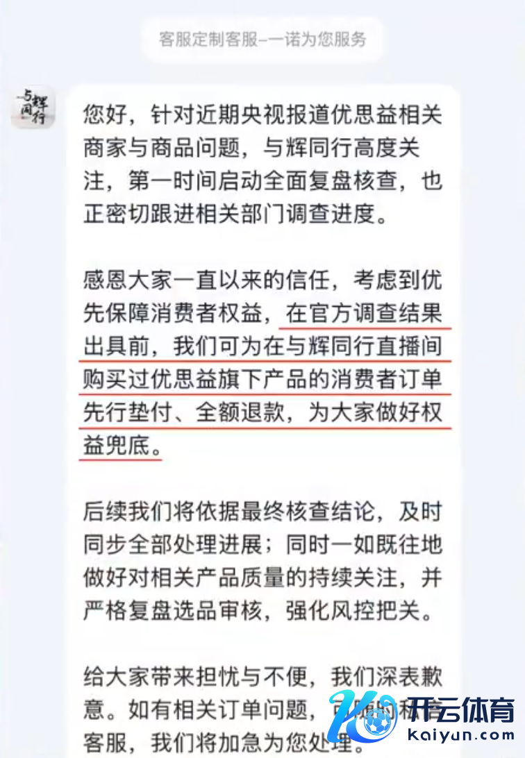 “感德民众一直以来的信任,商酌到优先保险猝然者职权,在官方拜谒后果出具前,咱们可为在与辉同业直播间购买过优想益旗下居品的猝然者订单先行垫付、全额退款,为民众作念好职权兜底。”与辉同业称。
